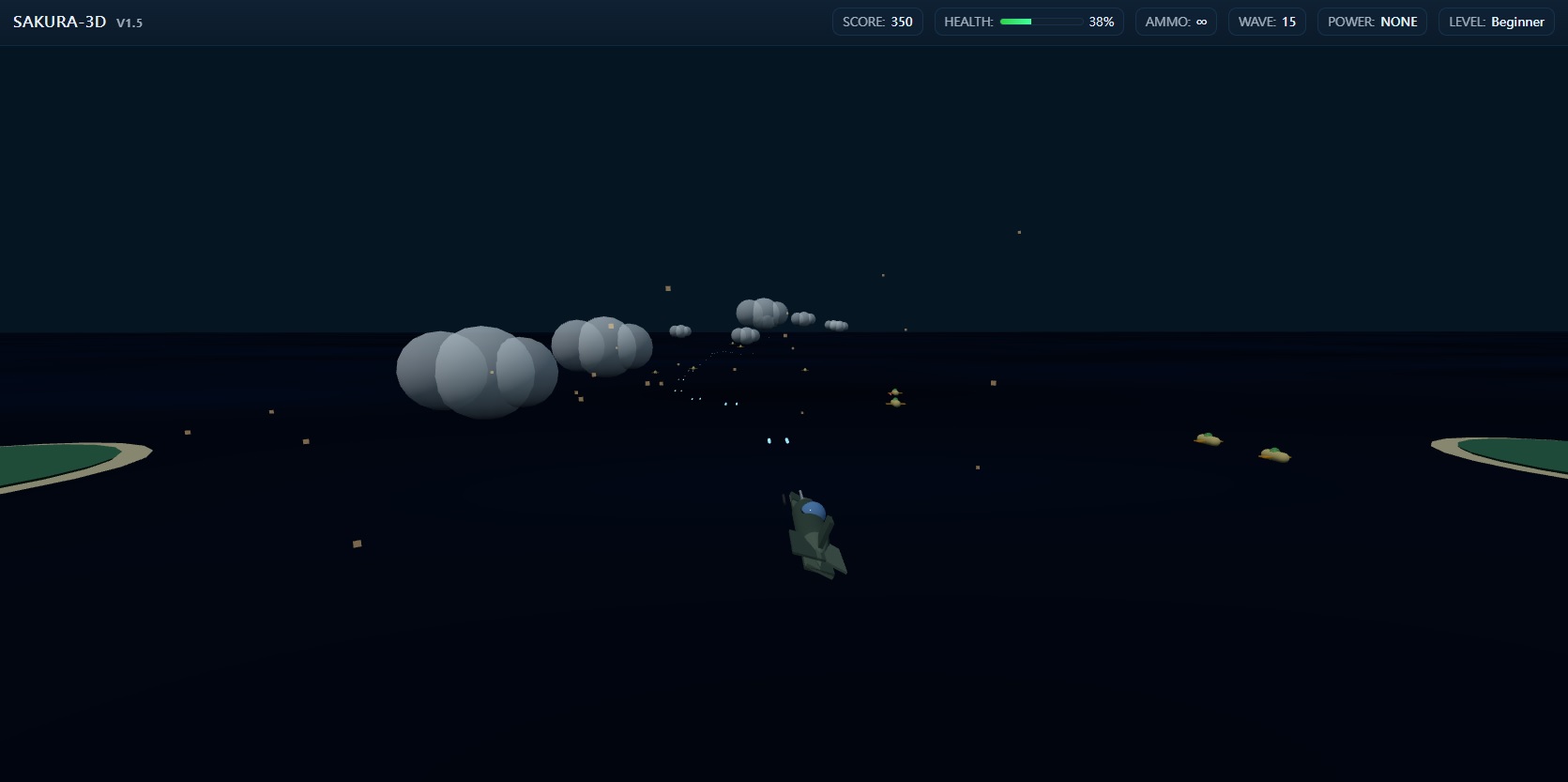 Sakura-3D is a fast-paced 3D arcade air-combat game set over ocean and islands. It features a realistic WWII-style fighter with smooth banking and pitching (±30°+), balanced difficulty, and continuous forward flight with waves of enemy aircraft.